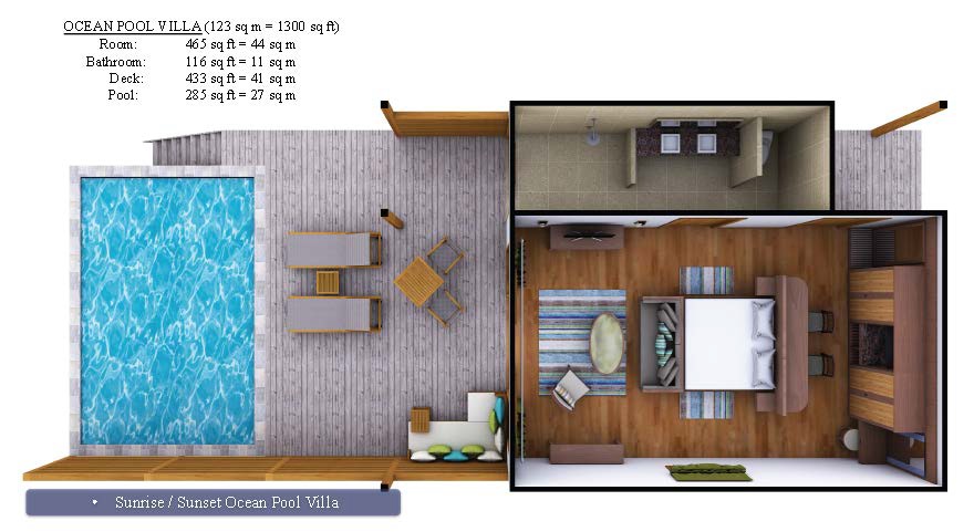 Площадь номера — 132 кв.м. Водные виллы с бассейном. Состоят из спальни с большой двуспальной кроватью, гостиной зоны, ванной комнаты с тропическим душем, террасы с шезлонгами и бассейном.