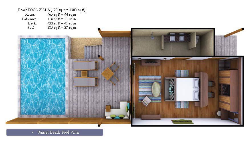 Площадь номера — 132 кв.м. Пляжные виллы с бассейном, расположены всего в нескольких шагах от пляжа и уютной лагуны. Состоят из спальни с большой двуспальной кроватью, гостиной зоны, ванной комнаты с тропическим душем, террасы с шезлонгами и бассейном.