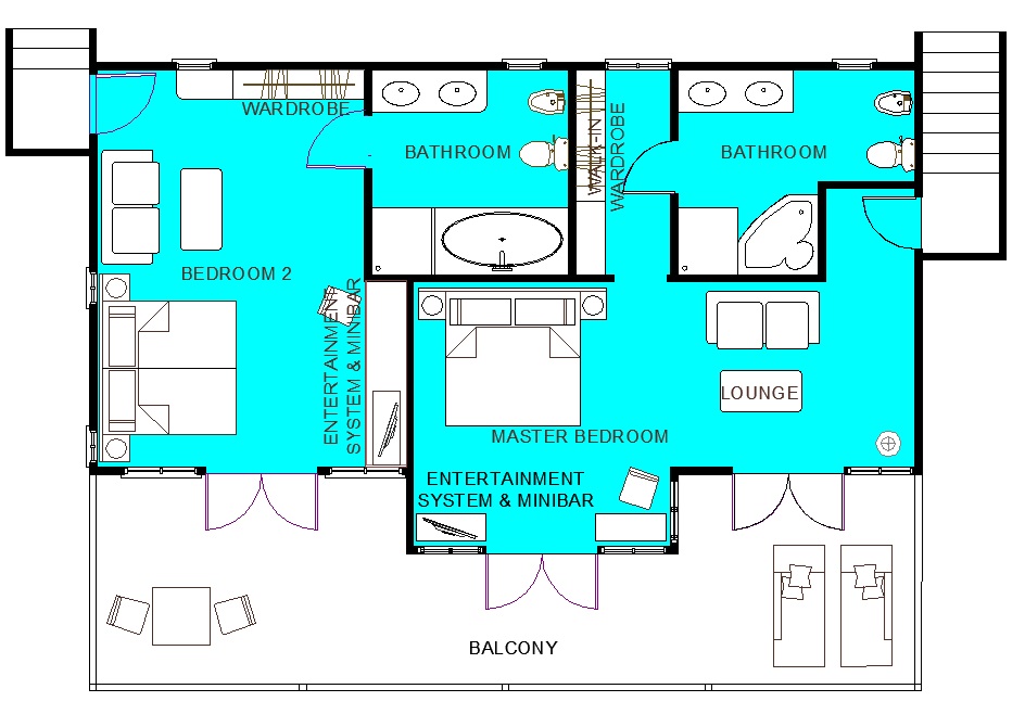 Состоят из главной спальни с двуспальной кроватью и зоной отдыха; второй спальни с двуспальной или раздельными кроватями; двух ванных комнат с ванной и душем; гостиной с мягкой мебелью и журнальным столиком; гардеробной; балкона с шезлонгами и обеденной зоной на свежем воздухе. Каждая спальня имеет отдельный вход, соединяются через балкон. ПЛАН НОМЕРА